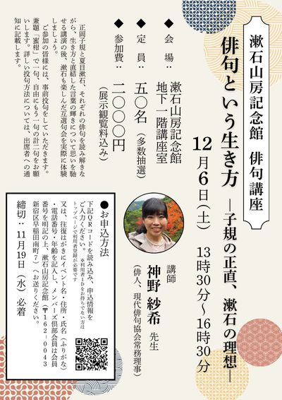 新宿区立漱石山房による俳句講座「俳句という生き方-子規の正直、漱石の理想-」が、2025年12月6日に開催される。講師は神野紗希。講演後は、互選句会を実際に体験できる(兼題「蜜柑」で1句、自由にもう1句の計2句を事前投句)。