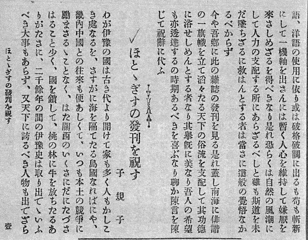 一方で、「小日本」「海南新聞」の使用活字は、東京築地活版製造所発行の活字見本帳『五号明朝活字書体見本 全 明治廿七年六月改正』に見られる築地体の五号活字に近いように思われる。ただ、同一字種における異字形の活字の混入も多く、判別は容易ではない。また、「ほととぎす」第一号の使用活字は、『活字類見本 未完成』に見られる初期の五号活字の字形というより、時代が下がった明治43年、秀英舎鋳造部製文堂発行の活字見本帳『活版見本帖』掲載の改刻が進んだ五号活字に近い。