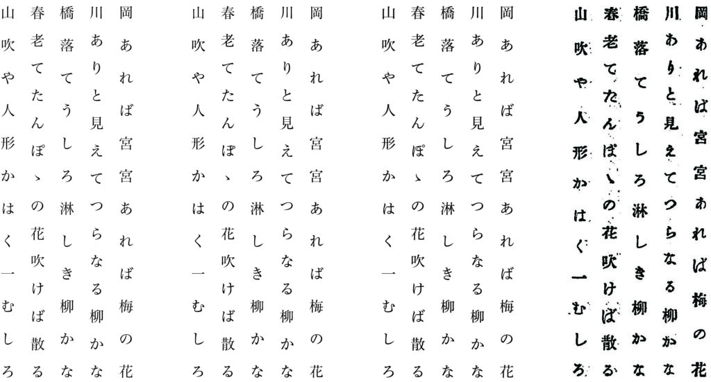 さらにここに、現代における一般的な書体をいくつか挙げてみる。『獺祭書屋俳句帖抄上巻』の組版を例にとり、デジタルフォントによって再現した。四つ並んだうちの右がオリジナルである。右二番目からそれぞれ、秀英明朝、リュウミン、ヒラギノ明朝という書体で組んである。秀英明朝はその名のとおり、秀英体を起源にもつ書体である。