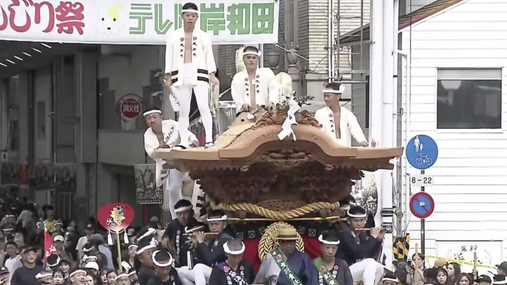「だんじり」と呼ばれる山車が豪快に駆け巡る。法被を着た「大工方」がうちわを手に屋根で舞う。