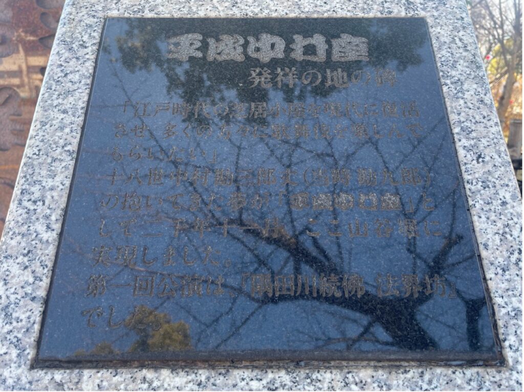 「平成中村座」は、十八世中村勘三郎(1955〜2012)が、「江戸時代の芝居小屋を現代に復活させ、多くの方々に歌舞伎を楽しんでもらいたい」と2000年11月に立ち上げたもので、初演の地は浅草の隅田公園内にある山谷堀広場、演目は『隅田川続俤 法界坊』であった。浅草聖天町の町名の由来になった「待乳山聖天」の向かいに位置する山谷堀広場には、「平成中村座発祥の地」の石碑が建っている。