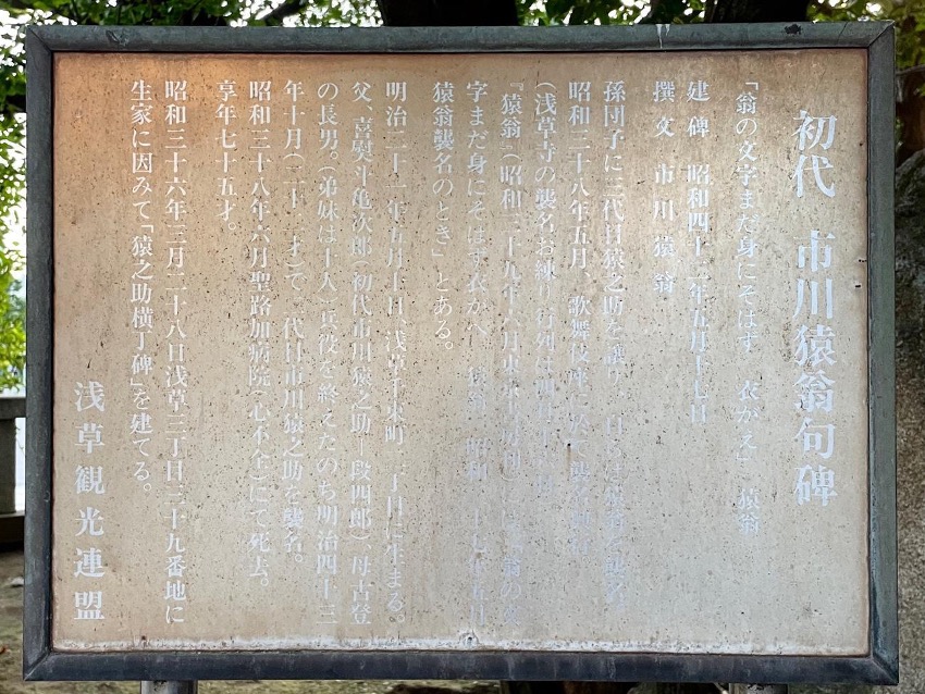 この初代猿翁の句碑が、浅草寺横の浅草神社境内に建てられている。
