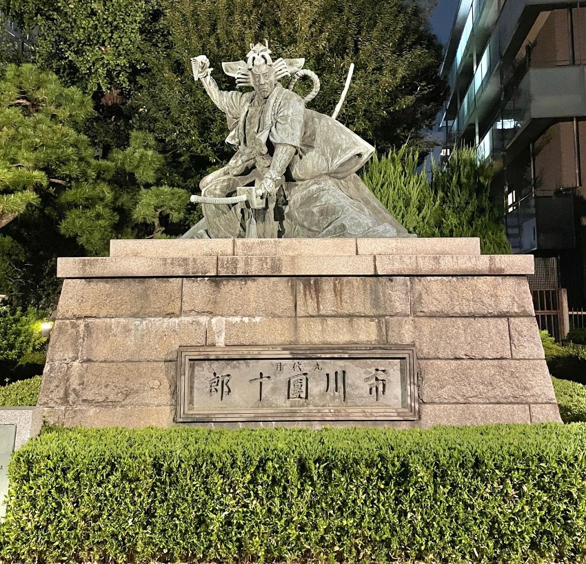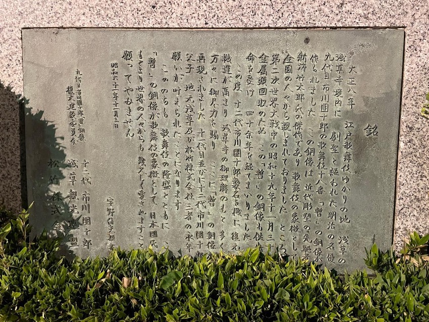 親子二代の師であった九代目市川團十郎の銅像が、浅草寺裏に建っている。