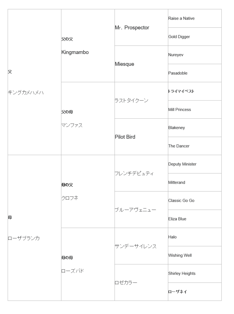 このように血統表の一番下の欄を辿っていくと、その馬のファミリーラインが見えてくる。