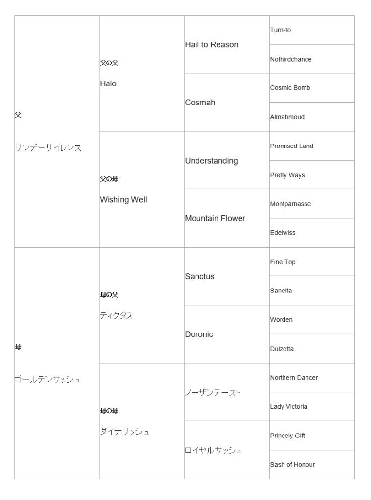 ファミリーラインとは、その競走馬の母系(牝系とも言う)のこと。