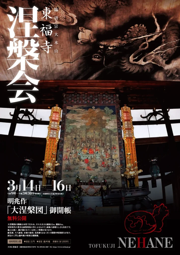 釈迦が入滅した2月15日(旧暦)に勤める追悼報恩のための法要のこと。入滅を描いた「涅槃絵図」が開帳となる。歴史仮名遣いは「ねはんゑ」。現在は、新暦の3月15日ごろに行われることが多い。