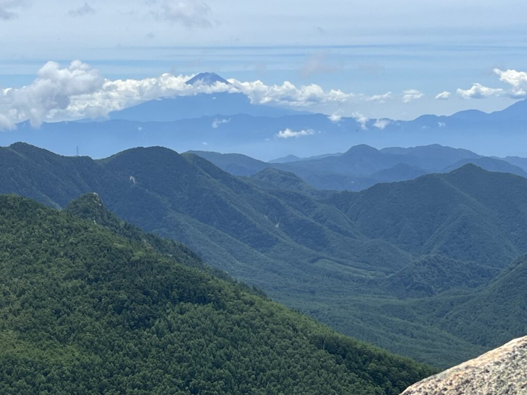 瑞牆山も日本百名山のひとつで、標高2230m。7月に登ったが、鎖を使って岩を登るという初心者にはインパクトのあるコースだった。巨岩・奇岩も多い。下山後は、脚があざだらけだった。それでも富士を堪能し、達成感を存分に味わった。