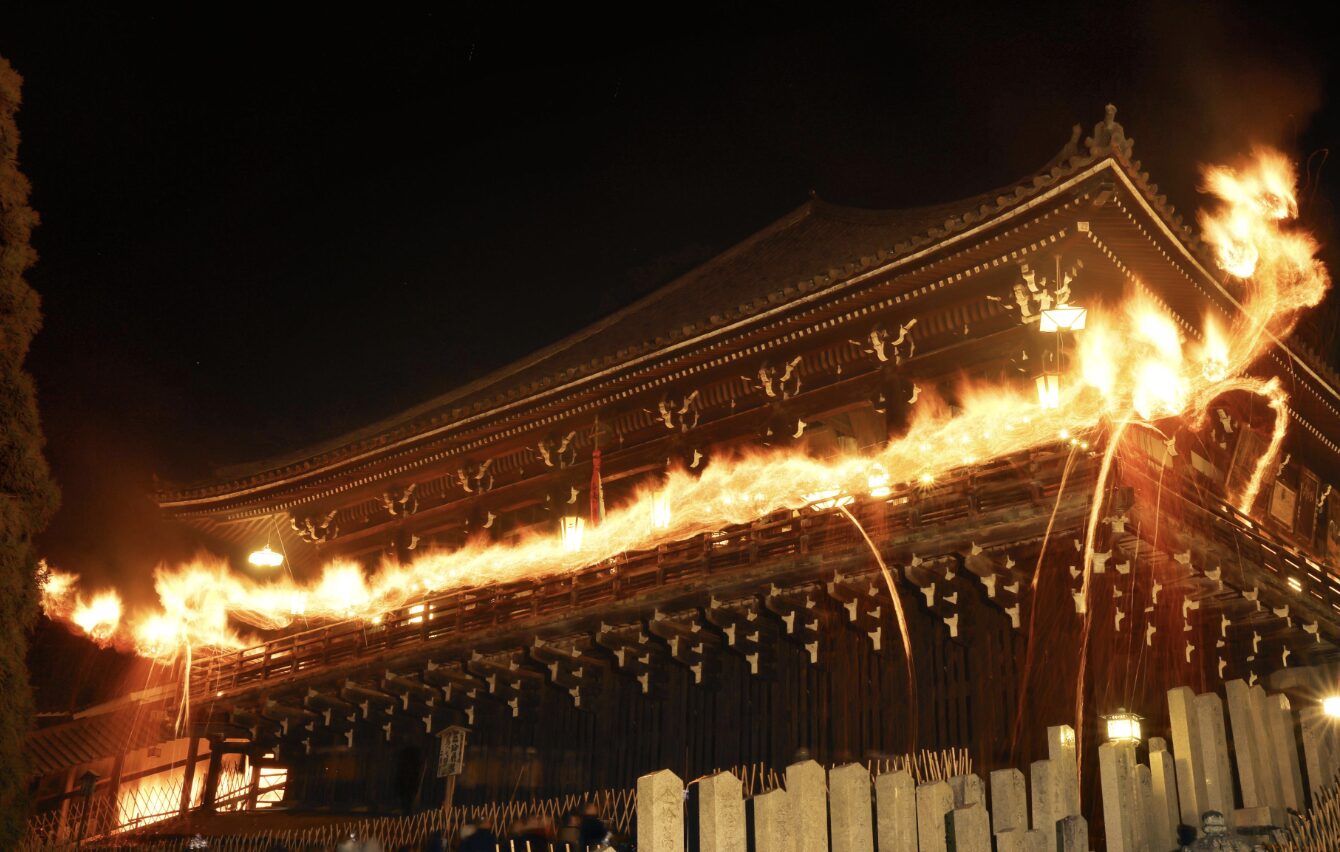 東大寺二月堂(奈良市)で行われる恒例行事。「お水取り」の名でも知られる。驚くべきことに、奈良時代の天平勝宝4(752)年に始まって以来途絶えていない。たいまつの火の粉がかかると健康になるといわれ、多くの参拝者が訪れる。疫病の流行や戦争でも中止にならず「不退の行法」とも呼ばれる。